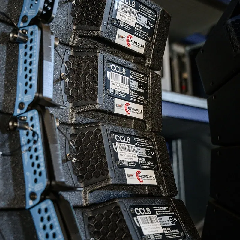 Ihre Veranstaltung verdient den besten Klang. Deshalb haben wir in modernste Event Tontechnik investiert: 12 Stück d&b CCL8 und 4 Stück d&b CCL12 – die neueste Generation der kompakten, kardioiden Line-Array-Systeme. Diese Tonanlage aus der CCL-Serie von d&b audiotechnik repräsentiert den neuesten Stand der Beschallungstechnik am Markt.